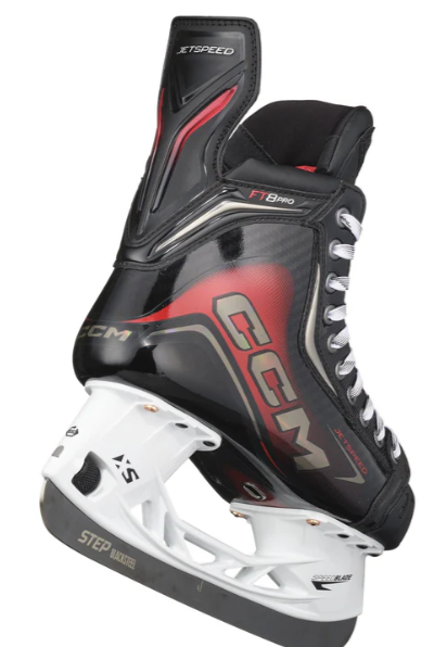 The JETSPEED FT8 PRO skates are designed for elite skaters who demand the ultimate speed, agility, and precision. Equipped with a 3D molded FORS™ composite one-piece boot, these skates excel in responsiveness and energy transfer, crucial for peak performance. The new forward pitch angle provides a more natural attack stance, allowing players to be quicker on their toes and feel more explosive in their strides. The ADPT Comfort Tongue and STEP BlackSteel runners with diamond-like carbon coating offer unmatched fit and enduring edge sharpness. The Totaldri Pro liner ensures your feet stay dry, while the seamless comfort configuration and ADPT memory Foam guarantee a custom, snug feel. Featuring the SpeedBlade XS holder for swift blade adjustments and a lightweight composite midsole, these skates are your secret weapon for gaining an edge on the ice.